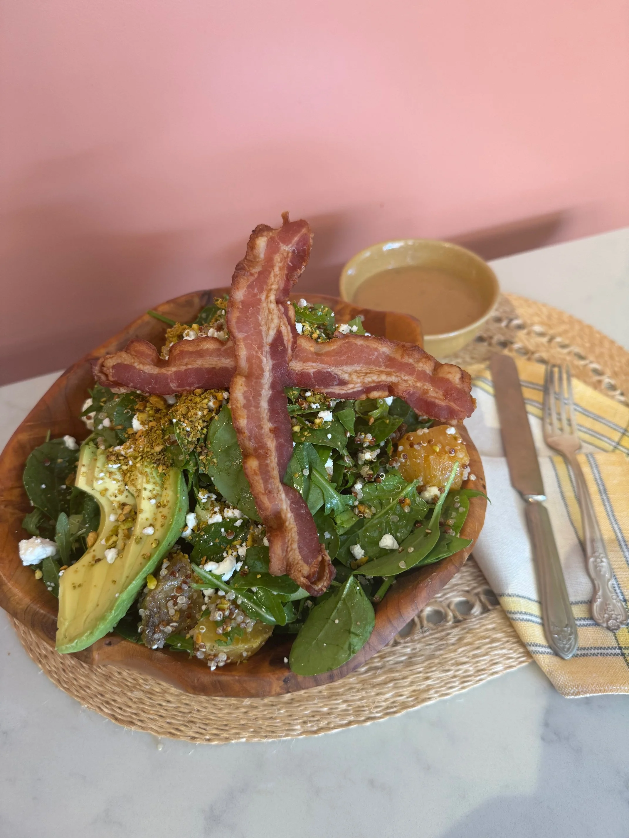 Fresh Arugula and Baby Spinach, Roasted Heirloom Beets, Avocado, Bacon Strips, Quinoa, Apple, Pistachio, Golden Raisin, Goat Cheese & Red Wine Vinaigrette