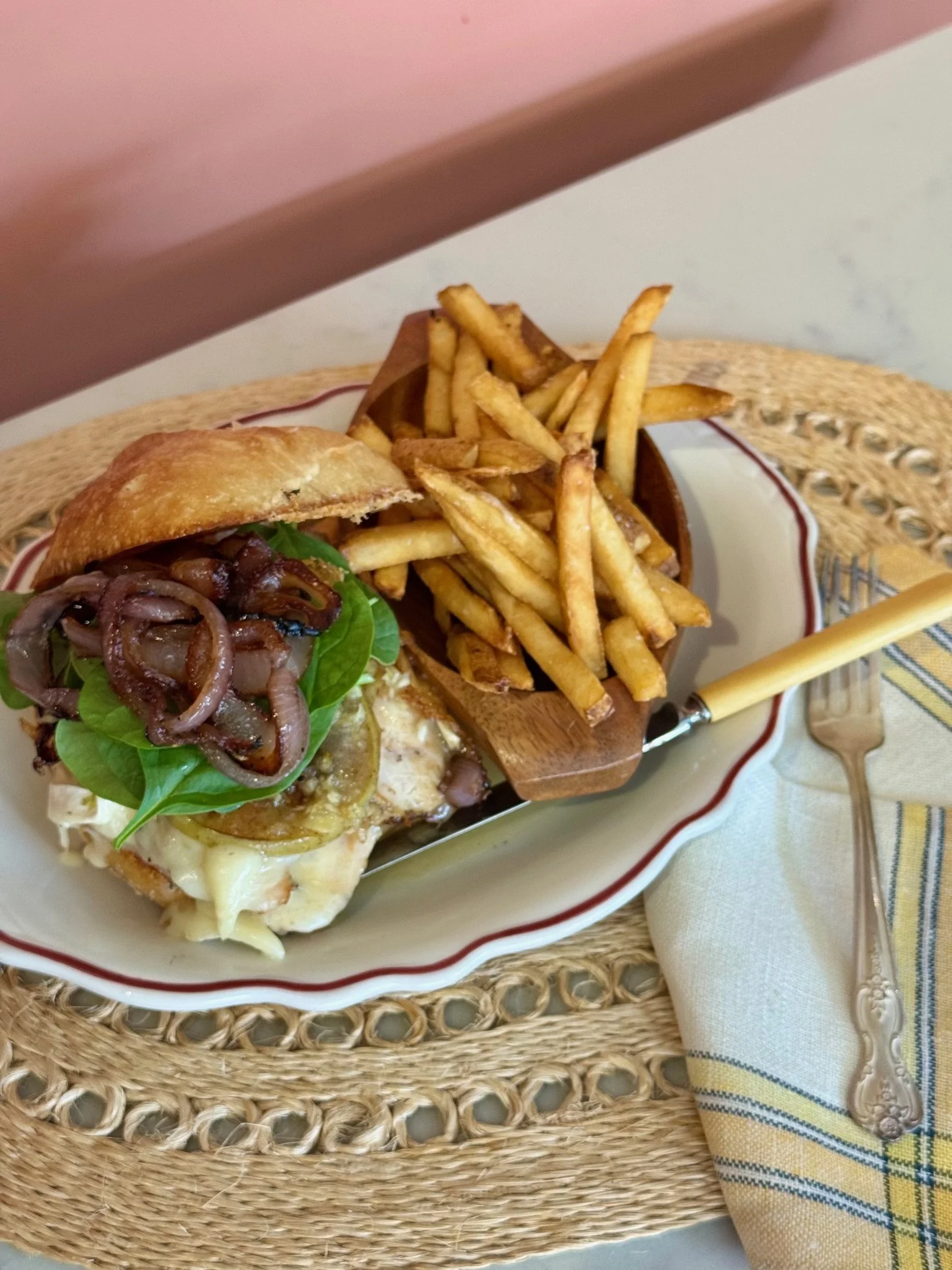 Sliced, Herb-Roasted Chicken, Garlic Aioli, Baked Apples, Brie Cheese, Baby Spinach, Roasted Onion and Ginger-Marmalade Glaze on a locally baked Ciabatta Roll